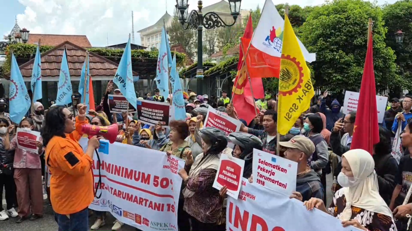 “Kami akan menampung dan mempertimbangkan aspirasi para buruh. Namun, mekanisme penetapan upah tetap harus mengacu pada ketentuan nasional yang berlaku,” kata Tri Saktiyana, yang tampak mengenakan batik cokelat.