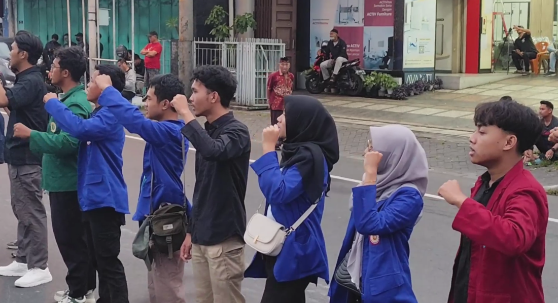 Sukoharjo – Sejumlah mahasiswa yang tergabung dalam Aliansi BEM Solo Raya menggelar aksi damai di Bundaran Tugu Kartasura, Sukoharjo, Jawa Tengah, untuk menagih janji kampanye satu tahun pemerintahan Prabowo Subianto dan Gibran Rakabuming Raka.