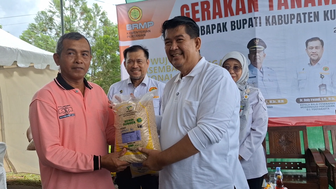 Dalam kegiatan tersebut, Balai Penerapan Modernisasi Pertanian (BRMP) DIY juga menyalurkan satu ton benih padi varietas Inpari 30 kepada dua kelompok tani setempat sebagai bentuk dukungan terhadap peningkatan produksi pertanian di Kulon Progo.