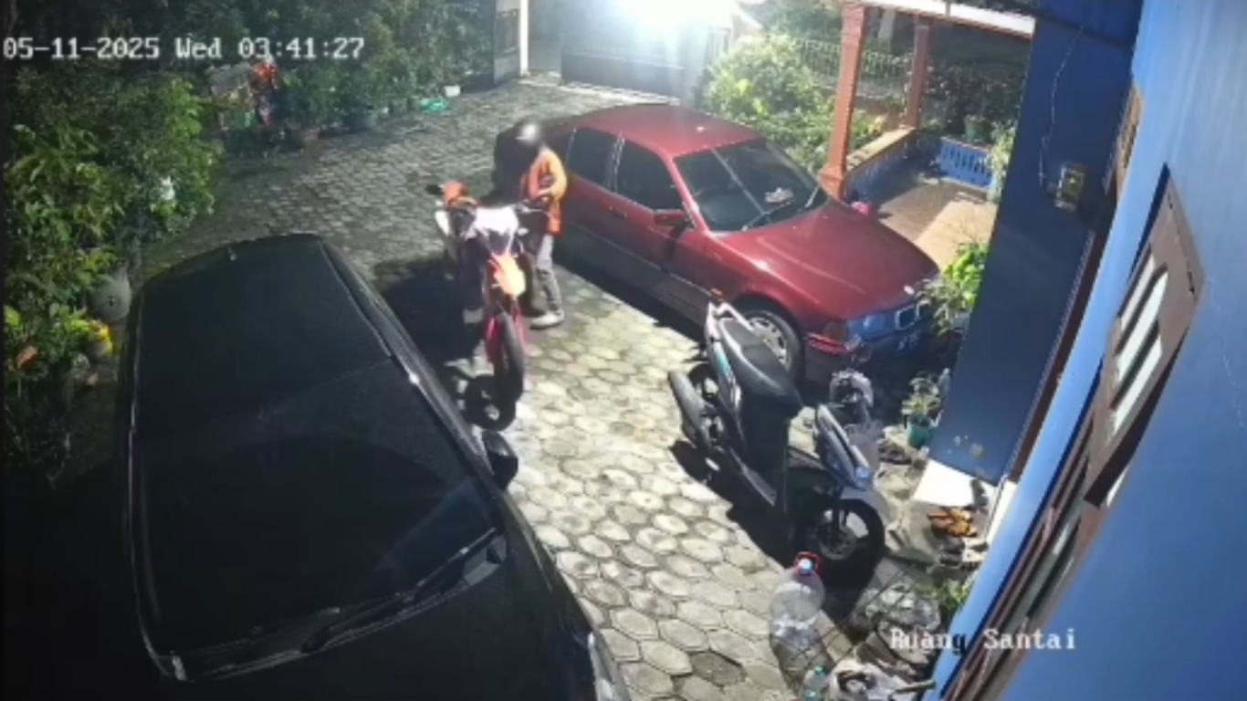 Aksi pencurian tersebut terekam kamera CCTV di sekitar lokasi. Dalam rekaman, tampak dua pelaku yang diduga terlibat. Salah satu pelaku terlihat menunggu di pinggir jalan, sedangkan pelaku lainnya mengenakan jaket oranye dan helm masuk ke halaman rumah korban dan membuka paksa pagar besi sebelum membawa kabur motor tersebut.