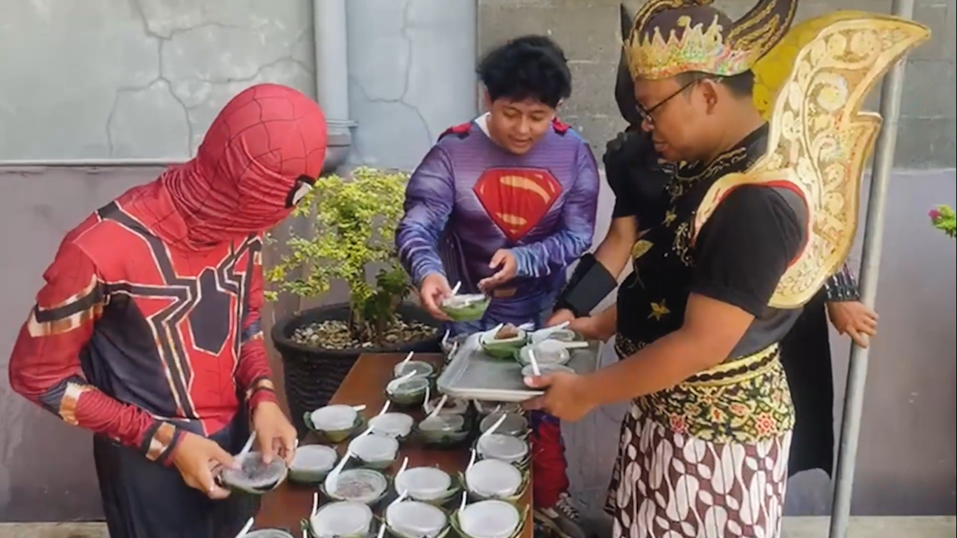 Menariknya, sejumlah peserta yang mengenakan kostum tokoh superhero dan pewayangan, seperti Gatotkaca, turut memikul gunungan jenang dalam kirab. Mereka berharap kehadiran karakter-karakter tersebut bisa menarik perhatian anak-anak agar lebih mencintai budaya dan kuliner lokal.