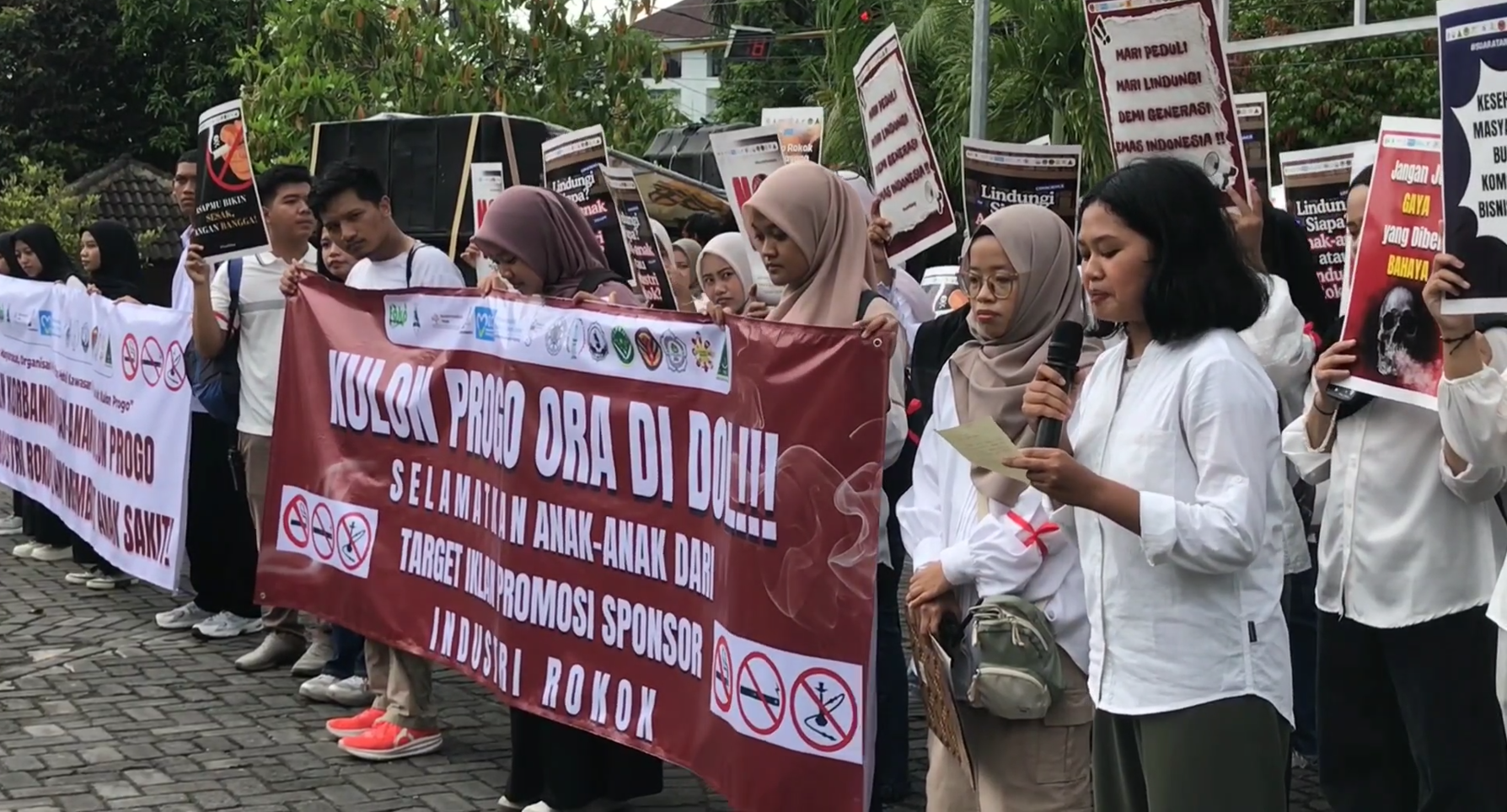 Kulon Progo — Sejumlah anak muda di Kabupaten Kulon Progo menggelar aksi damai di depan Gedung DPRD Kulon Progo sebagai bentuk penolakan terhadap rencana revisi Peraturan Daerah Nomor 5 Tahun 2014 tentang Kawasan Tanpa Rokok (KTR). Revisi tersebut dinilai berpotensi melonggarkan aturan promosi rokok dalam kegiatan publik, termasuk konser dan kegiatan sosial.