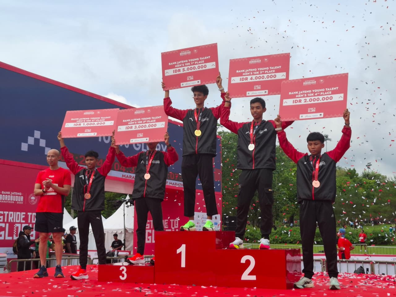 Magelang – Wajah baru mencuri perhatian di Borobudur Marathon 2025. Farid Radwan, pelari muda 17 tahun dari Malang, nomor Bank Jateng Young Talent menjadi juara kategori 10K dengan waktu impresif 33 menit 16 detik, sekaligus memecahkan rekor personalnya. Yang membuatnya lebih istimewa, ia berhasil mencatatkan personal best di trek yang ia anggap cukup menantang, terutama di kilometer 6 dan 7 dengan elevasi menanjak signifikan.