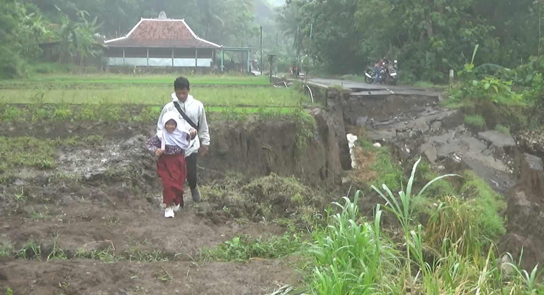 Bantul — Amblasnya jalan penghubung di kawasan Srikeminut, Kedungmiri, Sriharjo, Imogiri, Bantul menyebabkan puluhan siswa SD Negeri Kedungmiri kesulitan menuju sekolah setiap hari. Kondisi jalan yang putus membuat warga, terutama para orang tua, harus mengantar anak-anak mereka melewati jalur setapak yang berada tepat di tepi longsoran.