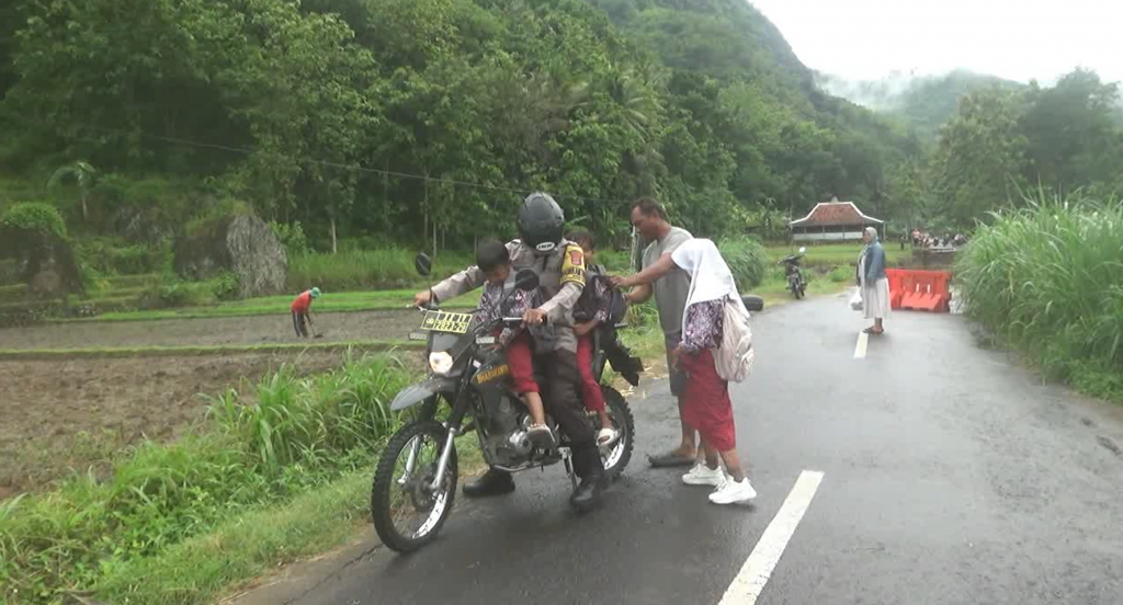 Karena itu, pihak sekolah bersama Bhabinkamtibmas berinisiasi menjemput para siswa di titik terputusnya jalan pada pagi hari dan mengantar kembali saat pulang sekolah untuk kemudian dijemput oleh orang tua masing-masing.